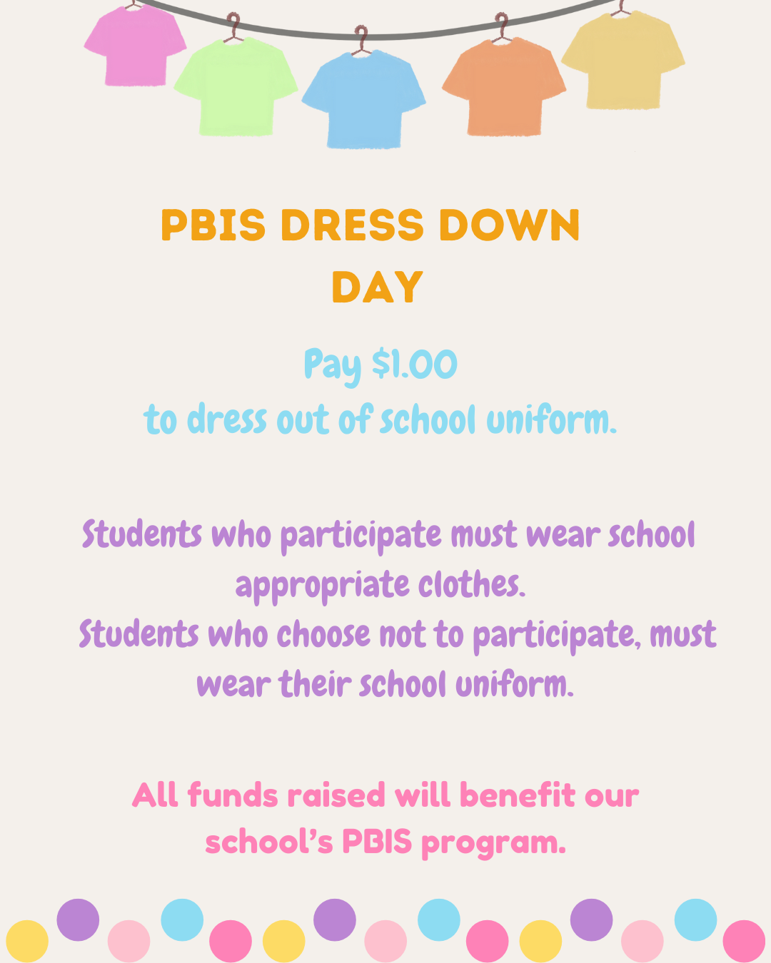 Students can pay $1.00 to dress out of school uniform. All funds raised will support our PBIS program. We can’t wait to see the outfits students choose to wear👕✨❤️